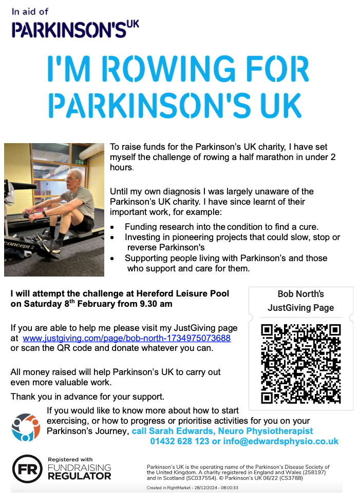 A Kington resident will be rowing a half marathon challenge in the Halo Centre at Hereford Leisure Pool on Saturday February 8 starting at 9.30am, to raise funds for the charity Parkinson’s UK.